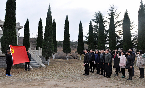 在晋城第一党组织创建者--陈立志纪念碑前,全体党员面对党旗重温了入党誓词。